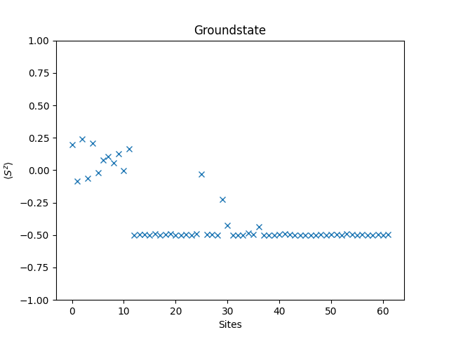 Another interesting quantity to look at is the expectation value of the spin polarization of the groundstate, i.e., for . The operator is provided by the spin_z function, and the application of the operator by the dot method, so the implementation is straight forward.
