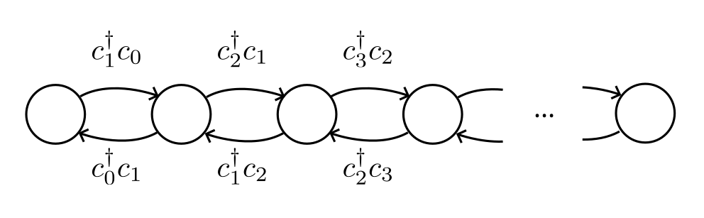 Note that Quantum Solver is also able to create vector spaces for a varying number of particles (see spinless_fermions.VectorSpace, HQS Quantum Solver Reference). Fixing the number of particles, however, reduces the amount of memory and computation time Quantum Solver needs.